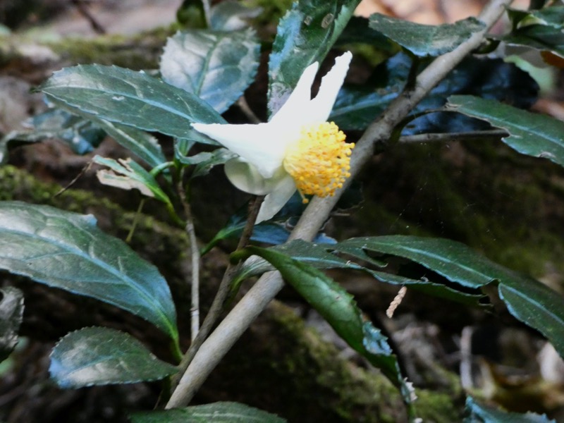 登山道脇に突然、白い花が現れた。お茶の花、と皆さんおっしゃる。確かにそれっぽいけど。どうしてこんな所に咲いているのかしら。昔、熊野古道だったか、やはり山の中で見かけたことがある。お茶は葉も花も食べることができるので、昔の旅人が食料を切らして困った時のために植えていたと教わったのを思い出した。ここは違う事情かも知れない。ちなみに、茶葉収穫のための茶畑では、花や実に余計な栄養を与えないよう花芽を摘むという。