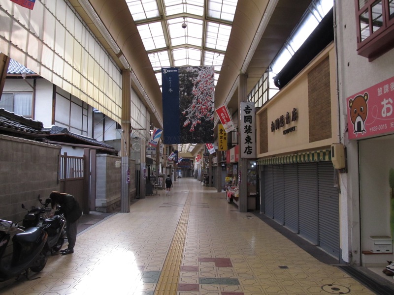 長いアーケード商店街が天理駅に向かって延々と伸びていきます。水曜日の夕方ですが、わりと閑散とした風景。私たちはここで簡単に腹ごしらえできる店があれば、天理の味を体験してみたいとも考えていたのですが、ラーメン店も含めて、入れそうな店は1軒もありません。それよりも驚いたのは私たちが知っている名前のチェーン店のたぐいが、日用品やファッション、コンビニも含めて、1軒たりとも見つからなかったことです。駅前広場に出た瞬間に、目の前にミスタードーナッツがあって、懐かしく感じたほどでした。