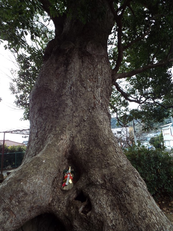 バスはこの大木をぐるっと一周して出ていきます。ちなみに五郎神社本殿の背後は深い森になっていて、ご神木としてこれより大きなクスノキがあるとか。