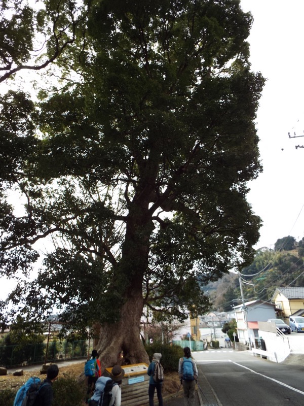 先発ウォーミングアップ付きの組だった私は、村社 五郎神社はトイレだけ。階段上の樹齢850年? のご神木を見そびれました。これは鳥居外のクスノキの巨木。十分な迫力です。頼朝の戦勝祈願も見たでしょうか。道すがら神社裏手にもたくさんの巨木がありました。