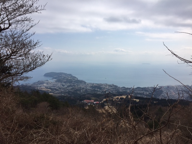 南郷山への道を登っていくと、湯河原の街が見えてきました。沖合に浮かぶのは大島ではなくて初島。右手奥には伊豆半島の大室山あたりが見えています。