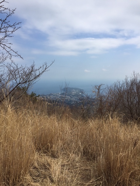 少し歩いて振り返ると視界が開け、湯河原の町と海が目に飛び込んできた。初島が近い。