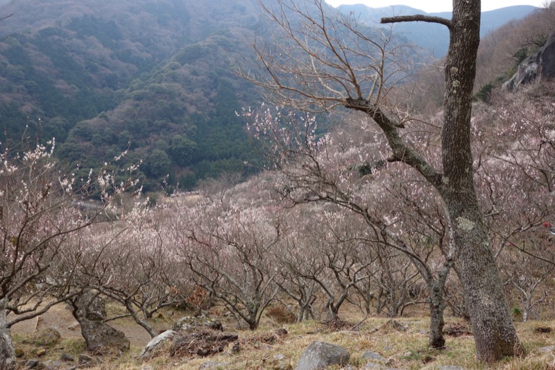 だんだんと全貌が現れてきた。ちょっとピークは過ぎた感じが否めないが、それでもこれだけの斜面に広がる梅林はなかなかだ。埼玉の越生の梅林は、風格のある古木がたくさんある観光梅林のほか、広い平地に梅栽培農家の整然と植えられた長閑な梅林が周囲をとり巻き、まったく趣が違う。