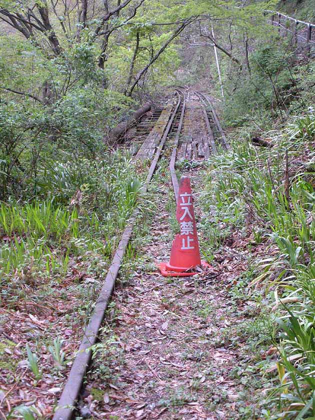 突如出現した古い鉄道軌道。この線路はその後もつかずはなれず私たちのまわりにありました。小河内ダム建設のための工事用鉄道であったといいます。