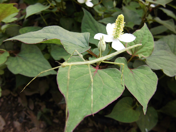 【02】ドクダミの葉っぱに乗ったナナフシ……のまねをするアリ 撮ったときにはそこまで見えていませんでしたが。