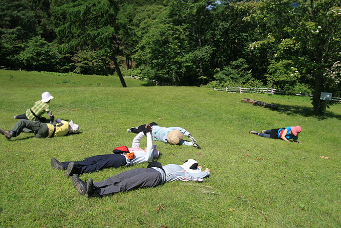 【05】丸山の場合にはかならずここで、頭を下にして寝ころぶという体験を私は強要します。絶妙な傾斜の草原だから気持ちがいい。気持ちがいいというより見える世界が違うのです。(話は飛びますが、白馬岳の坊主岩屋の前の岩でこれをやってみてください。槍ヶ岳の極めつけのパノラマが体験できます)この日はその後、斜面を転がり落ちる遊びにまでエスカレート。