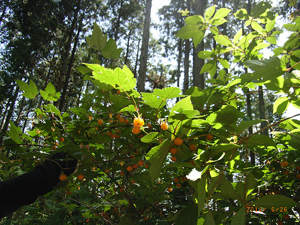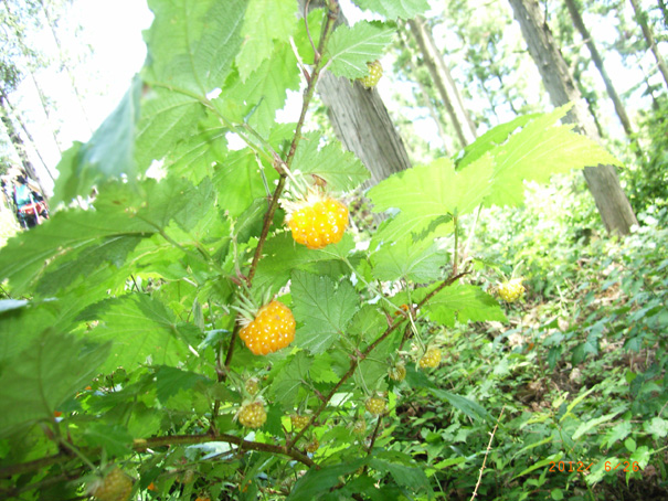 【08】モミジイチゴ、登山道によくあるらしいが、食べたのははじめて。トゲがあるので、実を採るときは要注意!