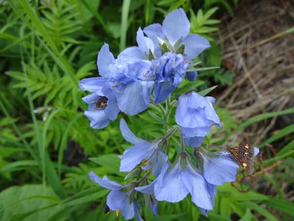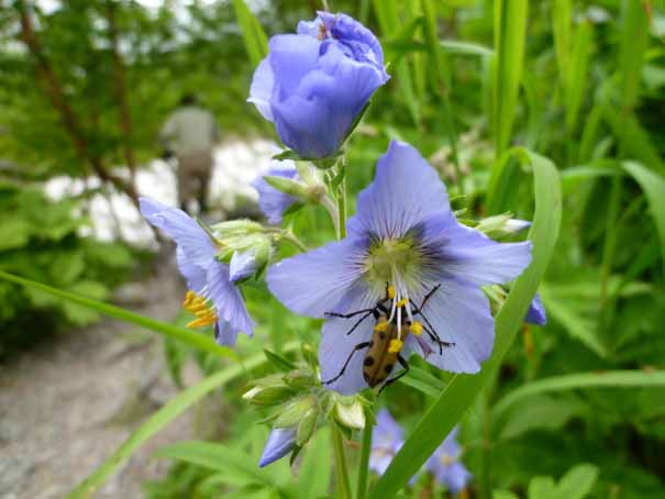 【23】ミヤマハナシノブ……この花を見るために、わざわざ大樺沢を二股まで上がりました。今年は雪が多かったようで、花は群落にまでならず、点在する状態でした。しかしみごとに咲いた株がいくつもあって、長いミヤマハナシノブ休憩をとりました。花に群がっている昆虫たちは、カメラを近づけても微動だにしませんでした。