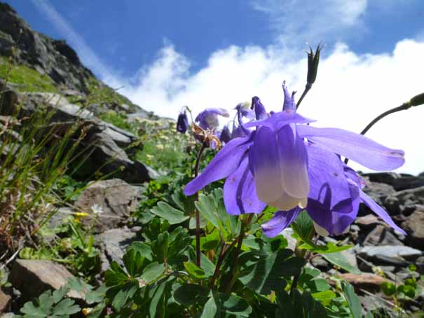 【08】ミヤマオダマキ……優雅で華やかな形、しかも大きくて目立つ。農鳥小屋間近の斜面岩場に群生。派手なくせに、うつむきかげん。思わずのぞきこんだら、青空と白雲…高度感が出た。