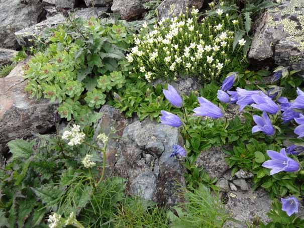【17】イワキキョウ、タカネツメクサ、イワベンケイ、左下はなんでしょう?ハハコヨモギ? 足元の小さな花に心癒されます。