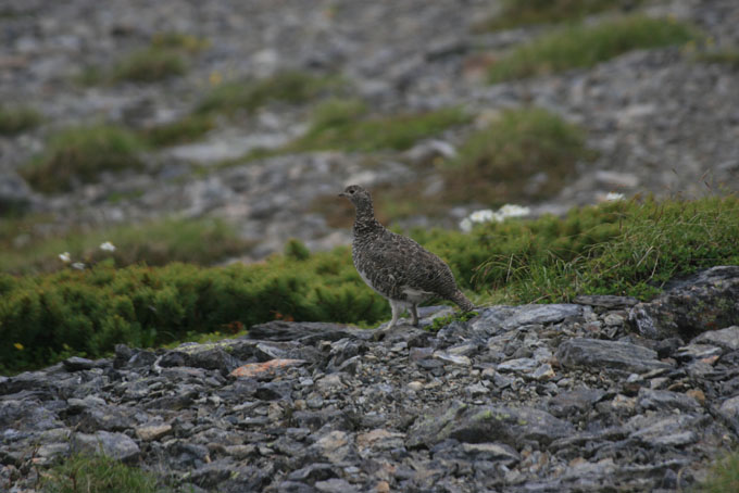 ライチョウ休憩に切り替えて何羽かのひなを連れた母さんライチョウをしばらくウォッチしました。この距離感より近づくことはありませんでしたが、とくに人間を意識している様子もなく……。