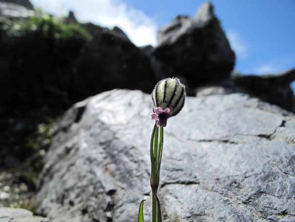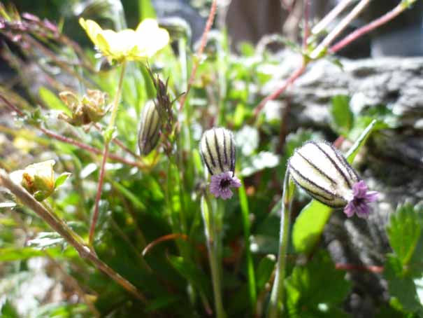 【22】タカネマンテマ……花は先端に小さく見えるピンク色の部分です。大きくふくらんだ風船状の部分は筒状のガク。なんのためにそんな構造なのかわかりませんが、筒状のガクはこの写真では下を向いていますが、しだいに上向きになってくるとか。この日、北岳に登った登山者はかなりの数に上りますが、タカネマンテマを見た人はあまりいないのではないかと思います。……よかった。けれど、ちょっと気になった岩壁の紫の花がミヤマムラサキだったと後で知って、近寄ってみればよかったと大反省。