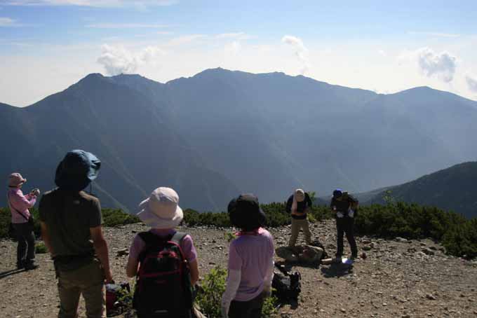 じつは「山4」と同じ場所から180度振り返ると、この風景。人が10人ほど立っているのが見えるのが今回5峰目の3,000m峰の農鳥岳山頂。