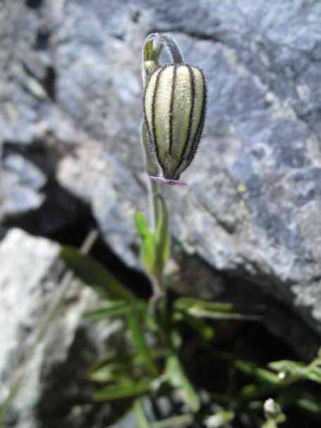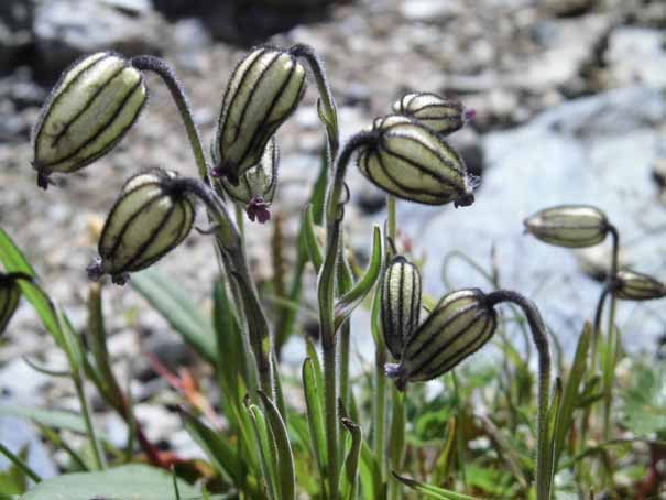 【20】タカネマンテマ……ついに見た!絶滅危惧種。短時間ではあったがしっかり愛でた。このままで、いつまでもと願う。図鑑で見ていた時は、桃色の花弁は2ミリと書いてあるにもかかわらず、やはり大きさを勘違いしていた。実物の愛らしいこと! 白く膨らんだのは「がく筒」とか。蜜泥棒対策だって? 黒っぽい縞模様に毛があるのは写真で初めて確認。肉眼では気づかず。何枚も撮ったが、どれも少々中途半端な写りだった。