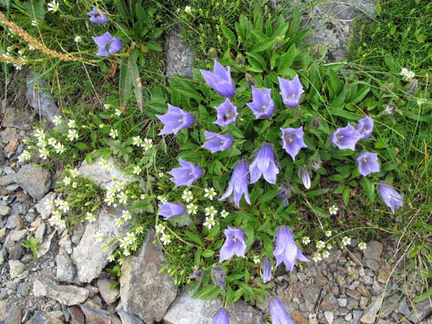【34】チシマギキョウとタカネツメクサ……イワギキョウばかりでしたが、間ノ岳からの下りでやっとチシマギキョウが。上を向いているように見えますが、横から撮った写真です。拡大して見ると毛がボワボワです。