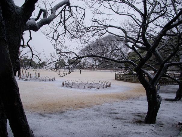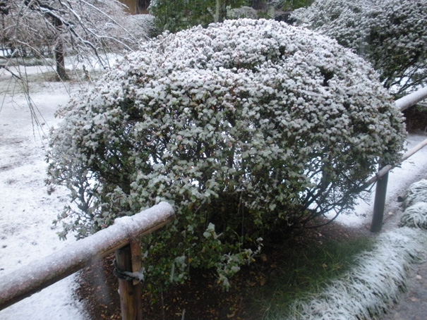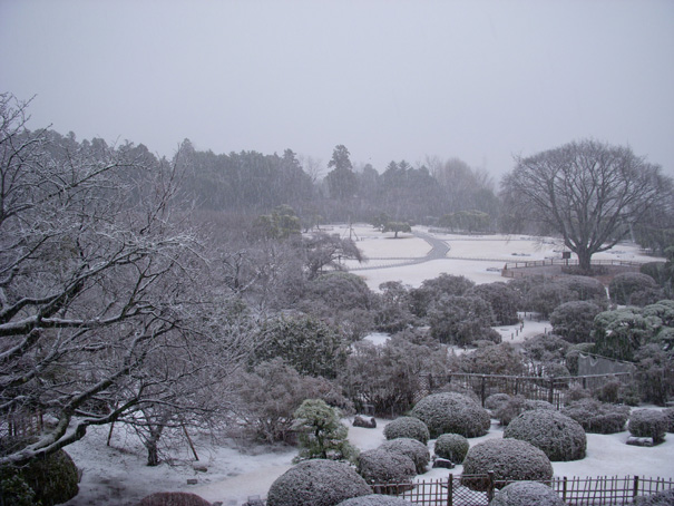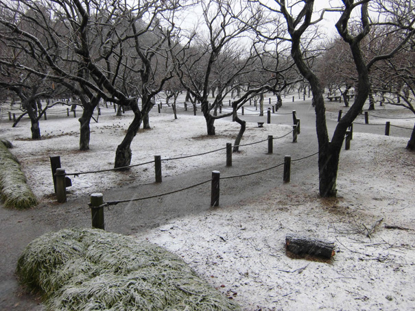偕楽園に入ると人っ子ひとりいません。駅前のホテルで豪華・格安ランチを食べていたときに雨に雪がまじりはじめました。ちょうどそのころ、都心ではすでに雪が積もり始めたと妻からの電話で知りました。その情報を追いかけるように水戸も雪景色になりました。降り始めて1時間というところでしょうか。