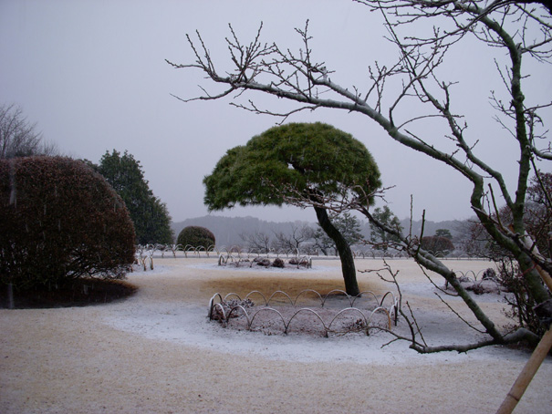 白い雪景色の中 松の緑が 印象的だった。日本庭園に松は必須かもしれない。