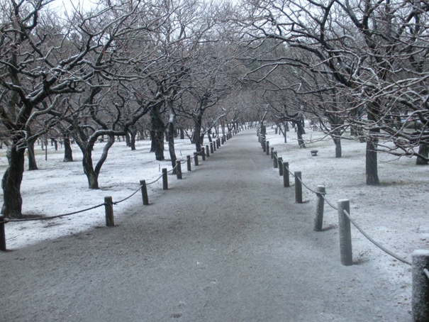 【16】偕楽園に入ると人っ子ひとりいません。駅前のホテルで豪華・格安ランチを食べていたときに雨に雪がまじりはじめたころ、都心ではすでに雪が積もり始めたと妻からの電話で知りました。その情報を追いかけるように水戸も雪景色になりました。降り始めて1時間というところでしょうか。
