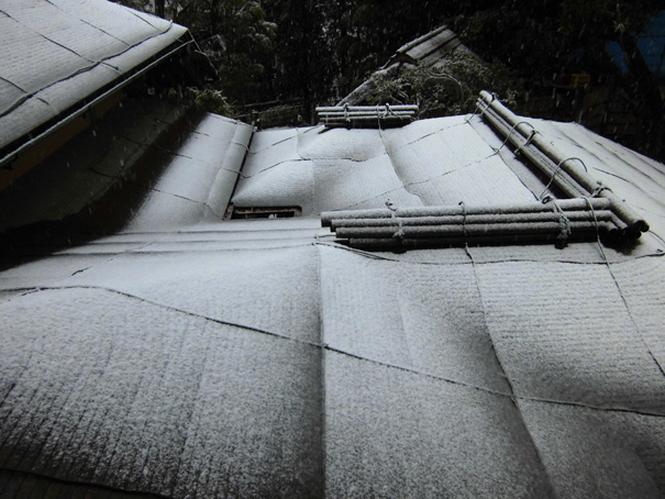 好文亭の屋根です。不思議な構造の屋根に、ふわっと積もり始めた雪。狭いと思って入ったら、内部はなかなか複雑で、松本城なんかよりドラマチック。とても不思議な建物でした。