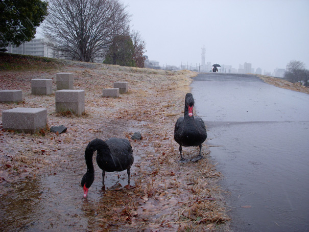 【17】千波湖に出たころから雪が本格的になりました。白い鳥はコブハクチョウ、ユリカモメ、ミコアイサなどとホームページにありました。でもずいぶんたくさんのコクチョウがいて、人間にチヤホヤされているためか、岸辺に寄ってきたり、道際でポーズをとったりしてくれました。