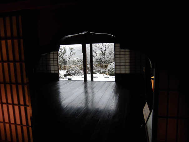 雪の降る日に、障子や雨戸を開けっ放しという風景は、慣れないのでずいぶん不安な気分になりました。でも雪見の風景とは豪勢です。