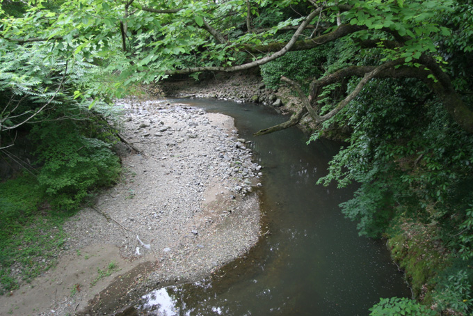 【07】これもまだ終点の上飯山バス停から飯山観音前バス停までのバス通り。小さな橋から下を覗くと、一丁前の浸食風景を作っている川の流れがありました。