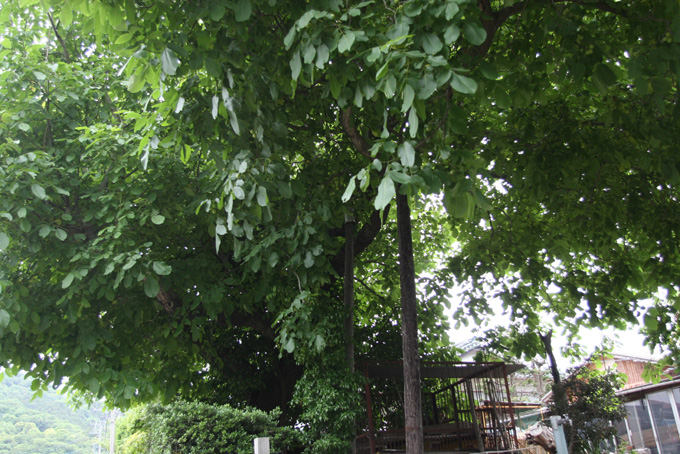 【13】何の木だかわかりませんが、大きく枝を広げた木が農家の入口にありました。見上げるとなにか立派な実をつけていました。写真にはうまく写りませんでしたが。