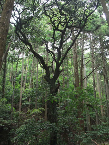 【15】白っぽく乾いた色で、幹がまっすぐな杉林の中に、(檜ではないですよね)突然、黒色で波のようにうねった木が現れ、ハッとしました。