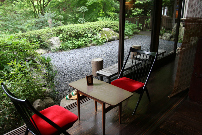 【09】最初の2枚で撮った喫茶スペースを庭側から撮りました。「携帯電話も繋がりにくい場所です」とホームページにありました。