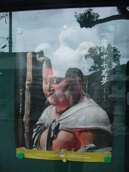 【18】やはり長谷寺。境内に入ると、ガラス張りの中にあるポスター(と、いうのか…)朱色のお顔の美しさと、まなざしの鋭さに魅かれました。仏様と景色と私が重なりました。