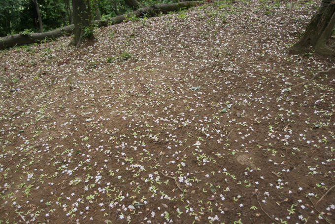 【26】道に散り敷かれていたのはエゴの木の花びら。それとグリーンのカエデのプロペラ。若葉のカエデが飛ばした種子だそうです。