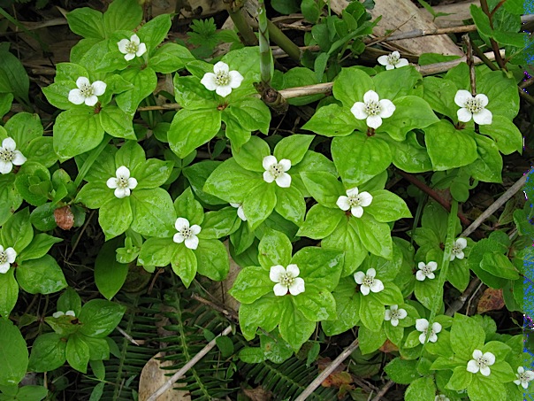 【03】ゴゼンタチバナは山によってはいくらでも、何度でも登場するけれど、このルートでは時おり小さな群落で現れた。ここに見えるのはぜんぶ花がついている。したがって葉は6枚。