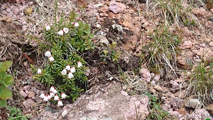この日満開だったといえるのはウラジロヨウラク。釣鐘型の花のピンクの色合いはいろいろだが、全体に控えめで上品。葉が白っぽいのは「裏白」だからではなく、霧の水滴が光っているため。