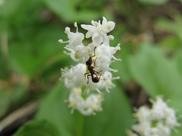 【07】マイヅルソウの花にもアリがいた。もう少しカメラを引くとマイズルソウ独特の美しい葉が見えてくるのだが、それはご想像のとおり、か、想像以上。東北地方で見るマイヅルソウには驚くほど大きく立派なものが多い。