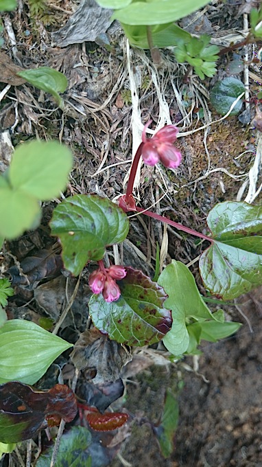 ゴゼンタチバナは山によってはいくらでも、何度でも登場するけれど、このルートでは時おり小さな群落で現れた。ここに見えるのはぜんぶ花がついている。したがって葉は6枚。