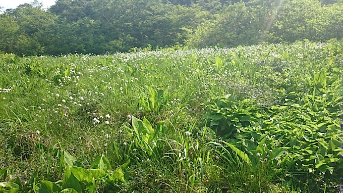 野地温泉に泊まった1日目は最高の天気だった。梅雨空からやわらかな日差しが差して、花がやわらかに浮かび上がってくる。雨に濡れてまだ乾ききっていないワタスゲが広がっていた。