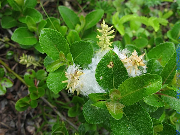 野地温泉から安達太良山へと向かった2日目、時おり濃いガスがかかる山肌でミネヤナギが濡れていた。白い綿毛が花のように目をひいた。