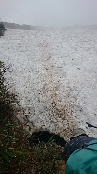 予期せぬ雪渓……まっすぐ登るのが登山道だが かなりの急斜面なので アイゼンなしでは無理なので 安全な所で左側を登ったが登山道にもどるのに 初めての藪漕ぎ体験 30分以上は藪の中を夢中で歩いた。
