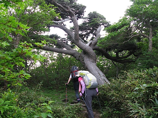 晴れた日なら強い光と、濃い影とがぶつかり合って、こういう風景は写真ではわかりにくくなってしまう。この日は曇天、というよりも濃いガス、薄いガスが流れて、光の表情が千変万化、ここでは古い針葉樹の巨木が3本、身をよじるように生きながらえてきた表情で並んでいた。山のヌシのようなこの木は柏槇(びゃくしん)なんて呼ばれるものだろうか。