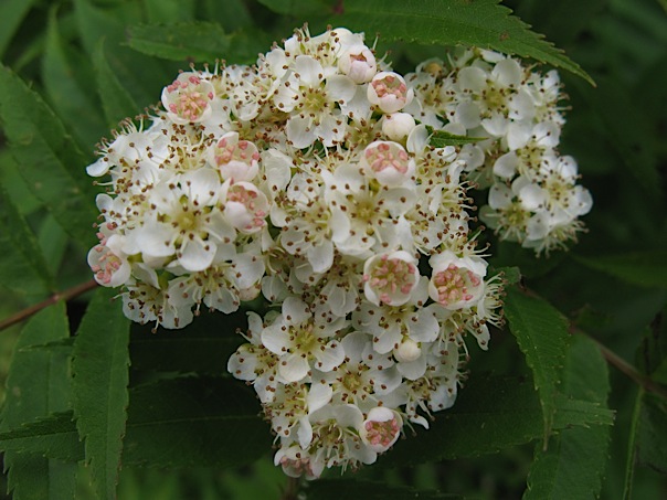 この美しい花は……なんだっけ? とあちこちいろいろ探し回ってしまったのは、クローズアップ写真しか撮っていなかったから。知らない花ならたぶんすこし引いて全体像も撮ろうとしただろうに、と思っていたところ、それに近い画像をネットで見つけて、思い出した。ナナカマド。秋に赤い実がついたときには、かなり引いた状態で見ていることが多いので、細い葉が枝から左右に並んでいる「羽状」という印象なのに、目を近づけると縁がギザギザの「鋸歯」という印象が強くなる。――え? 「美しいって?」という声が聞こえるので、もう1枚添えておきます。――え? 虫はどうした? って、知りませ〜ん。