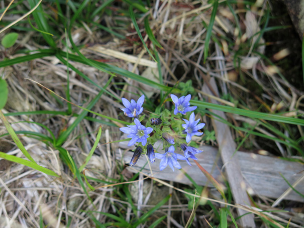 【03】お花畑は閑散とした感じだが、小さなリンドウ(たぶんミヤマリンドウ<リンドウ科>)はたくさん咲いていた。歩き始めてから6枚ほど撮っていたのだがすべて失敗、やっとまともに写せた。