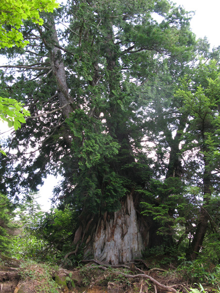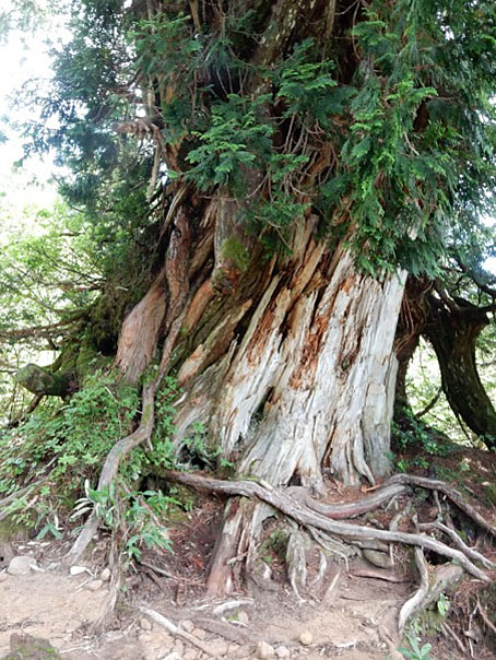 【07】折立登山口にはシンボルツリーというべきミズナラの大木がそびえていた。樹林帯を登ると、このヒノキ(だと思います)が森のヌシという感じで強烈な存在感を示していた。屋久島の縄文杉で感じたのと同様、長老という存在になるには、命に関わるような挫折を含めて人生にいろいろな出来事があり、身ひとつというよりは周囲の命を自分自身に取り込んで存在感を増していった……というドラマがあったのではないだろうか。