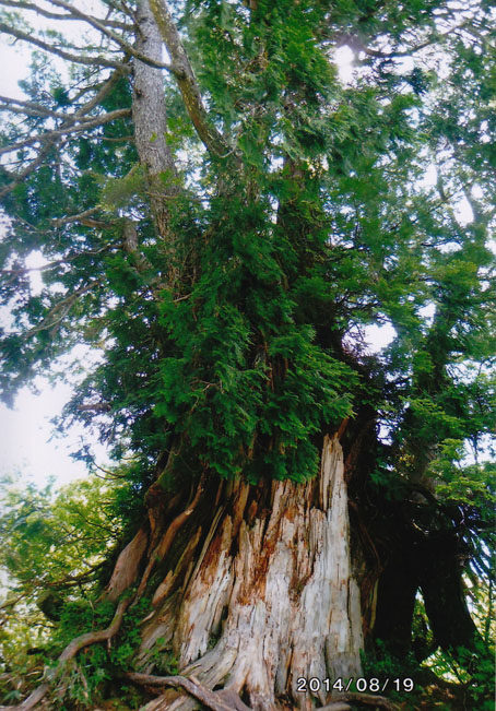 折立登山口にはシンボルツリーというべきミズナラの大木がそびえていた。樹林帯を登ると、このヒノキ(だと思います)が森のヌシという感じで強烈な存在感を示していた。屋久島の縄文杉で感じたのと同様、長老という存在になるには、命に関わるような挫折を含めて人生にいろいろな出来事があり、身ひとつというよりは周囲の命を自分自身に取り込んで存在感を増していった……というドラマがあったのではないだろうか。