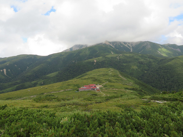 【10】太郎平小屋。残念ながら薬師岳には雲がかかってしまった。問題のお花畑は小屋の周辺にも気配がなく、不安が増してくる。