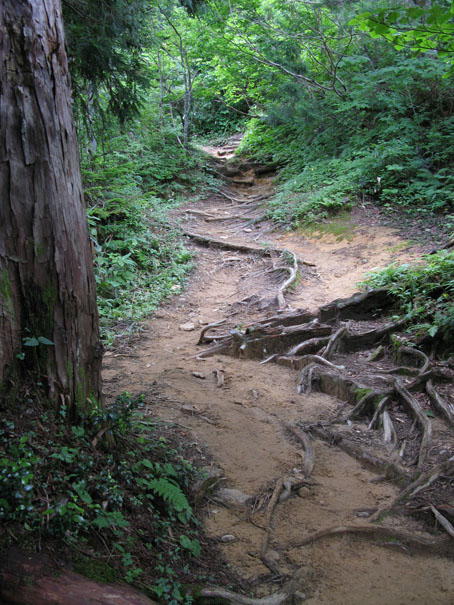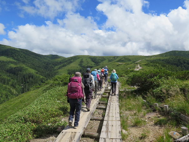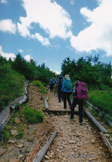 登りの終盤。道は一度激しく痛めつけられた後、修復されている。私たちの前を行くツアーグループと、その前を行く男性4人のグループとは休憩ごとに抜きつ抜かれつという関係。見えている尾根に登り切ったら、そこに太郎平小屋はある。