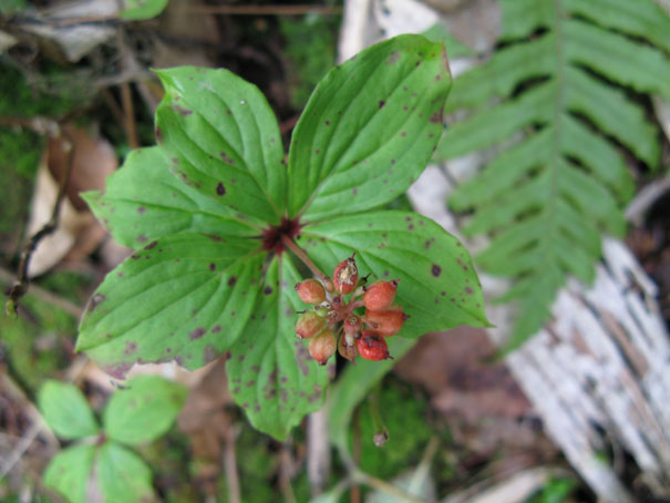 【17】最初に見たのはこのゴゼンタチバナ。花が終わって実がついたけれど、このまま赤いまん丸の実になるのだろうか? 疲れ切った感じがするので、今回の花の出現に関してあまり期待できない予感がする。