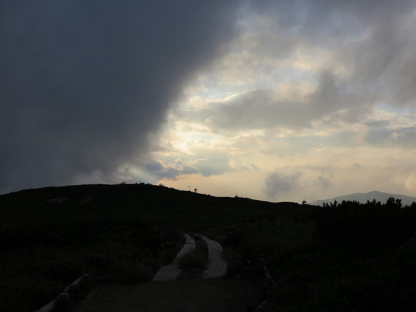 このときいっしょに夕日が見える期待をかけて五郎平小屋の前にいたのですが、この写真は「夕日」がテーマではなくなっています。闇に沈みそうな木道とはっきりしない黄昏の空。そこに幕引きしようとする眼前の山霧。夕暮れの、ちょっとアンバランスな風景が、次々に動いていくのを思い出しました。