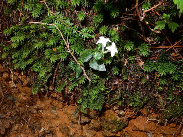 この花はアリドオシです。別名「一両」。センリョウ、マンリョウと似た赤い実をつけるそうです。ツルアリドオシというのもあるそうですが、どうでしょうか。