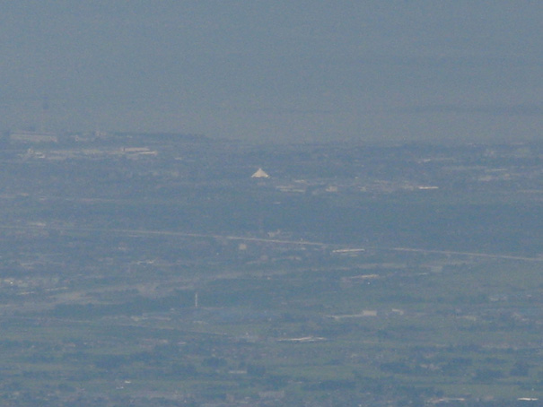 眼下に見えている海岸線と平野の中に白い三角屋根が見えていた。肉眼で見えない人もいたので6倍の双眼鏡を回したのだけれど、これはキヤノンのコンパクトカメラG7(かなりの旧型)の最大望遠域で撮ったもの。画質は悪いけれど双眼鏡で見た印象は記録している。