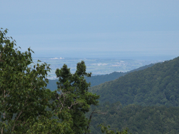 【29】振り返ると平野部が見える。よく見ると海岸線。その先に富山湾が広がっている。丹沢の塔ノ岳山頂から駿河湾を見ているのと似た高度差になっている。